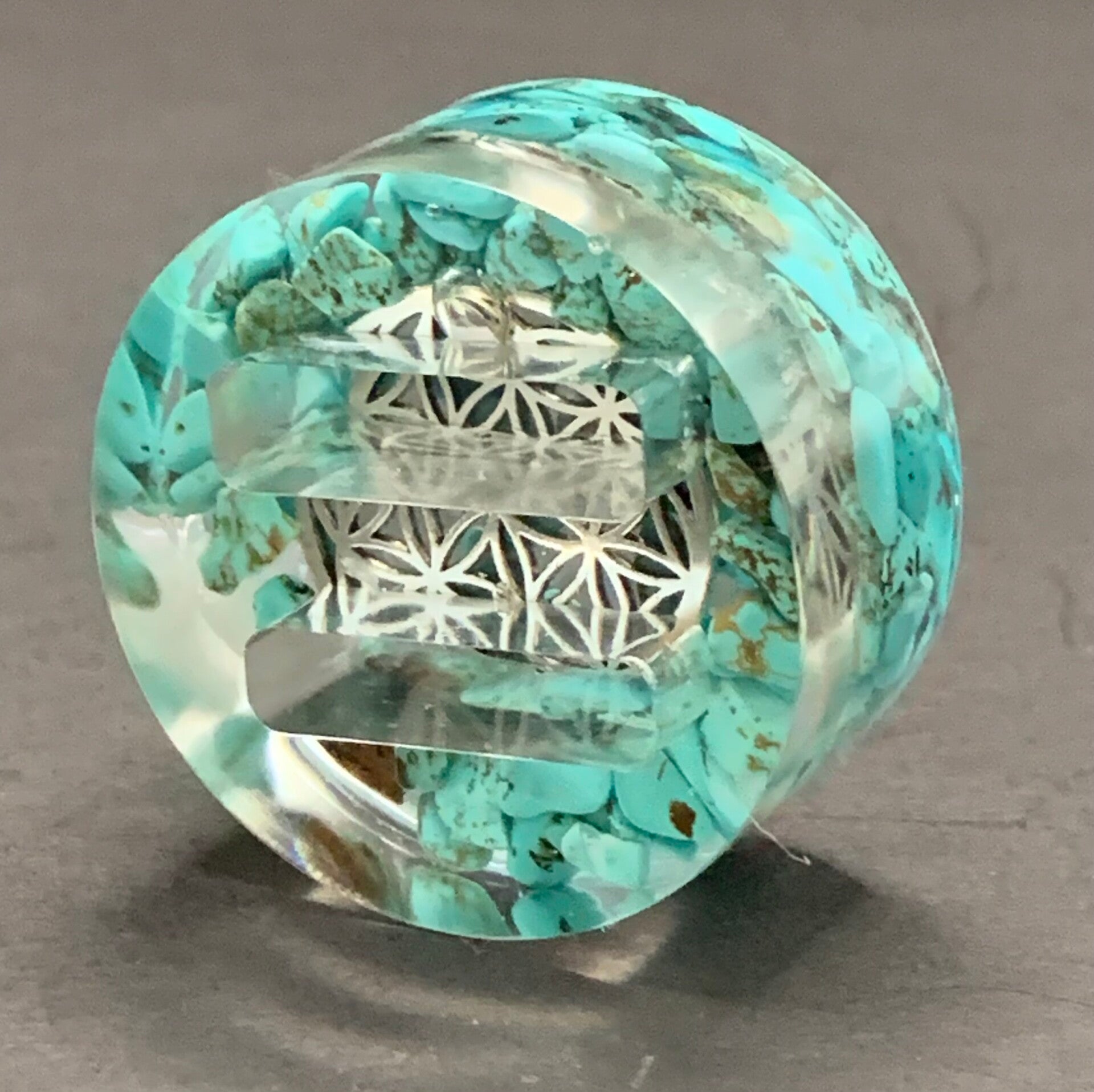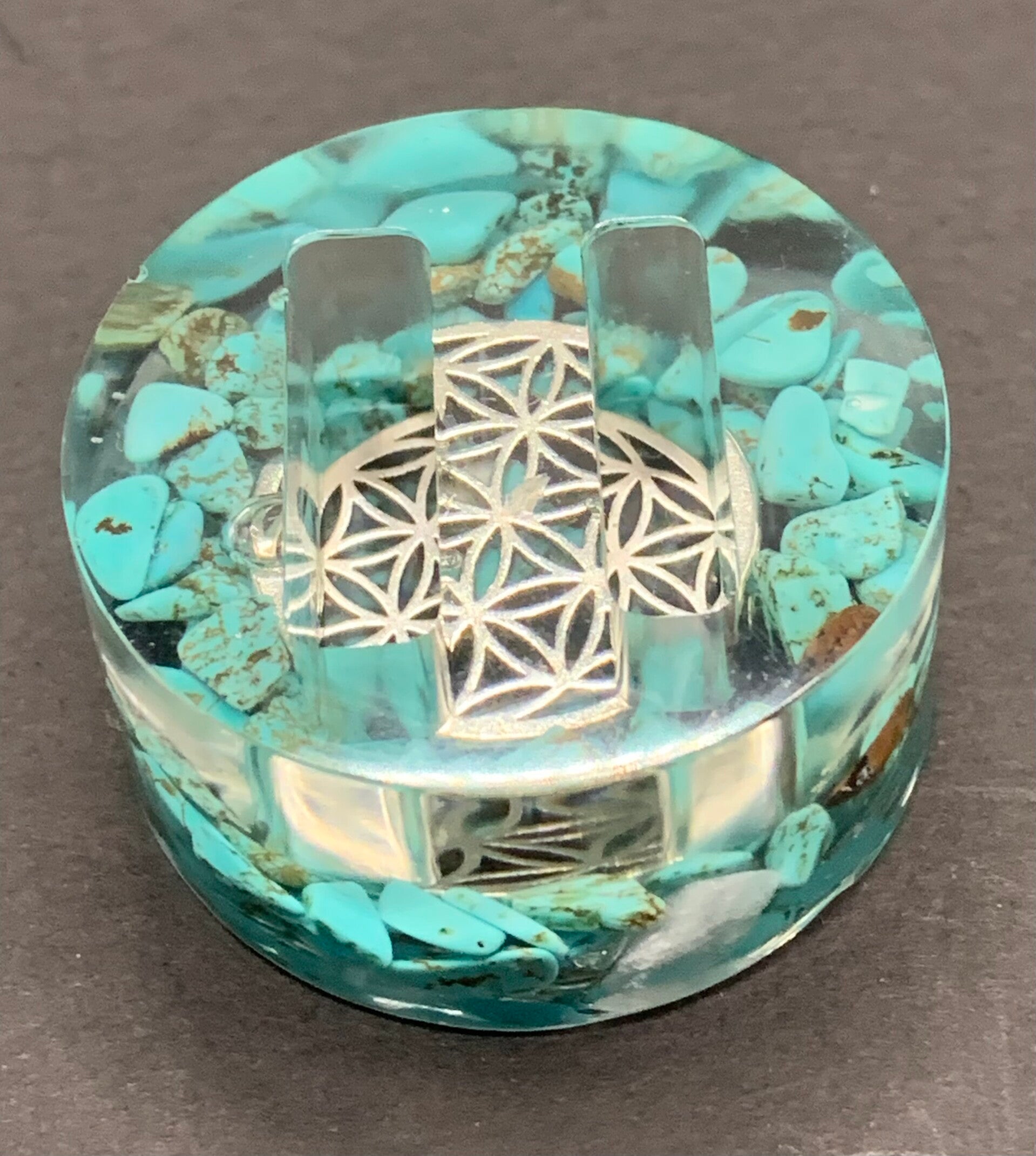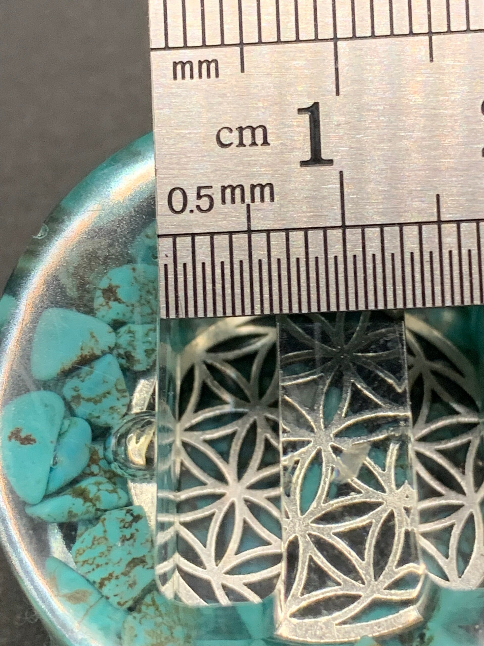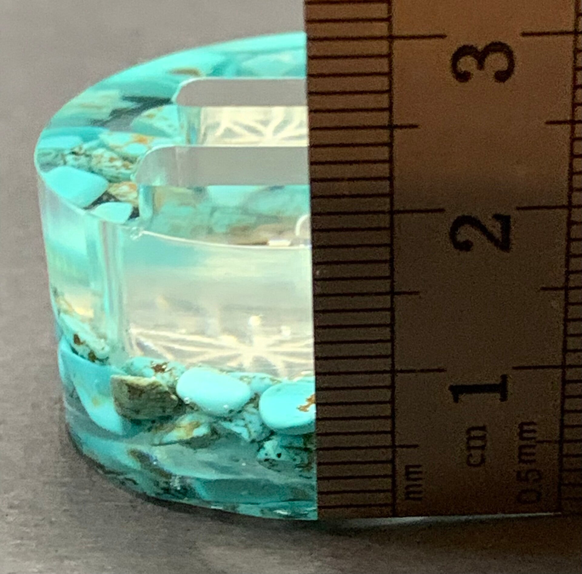Ce support porte-bague est composé de pierre naturelle de turquoise et d'une fleur de vie