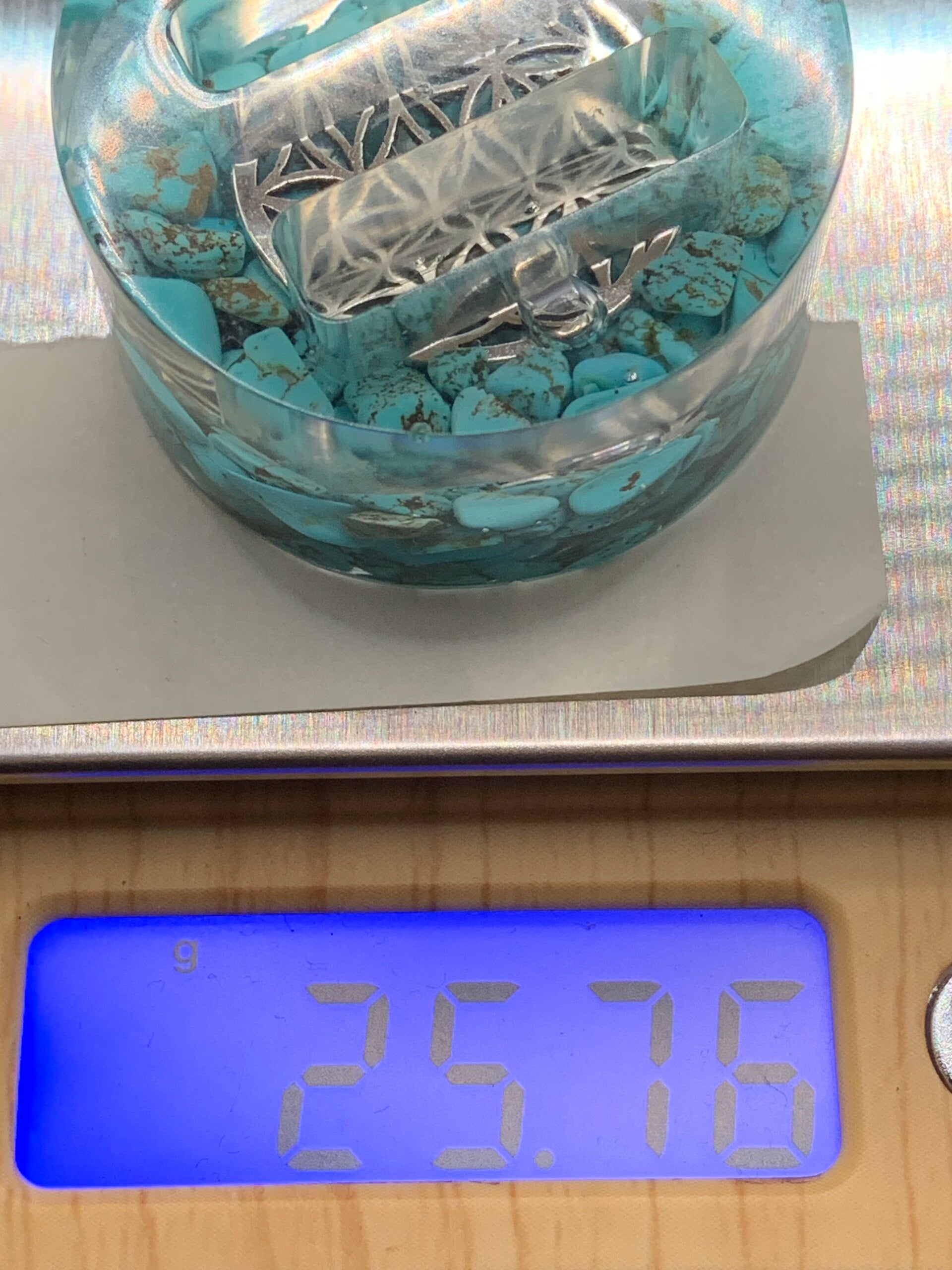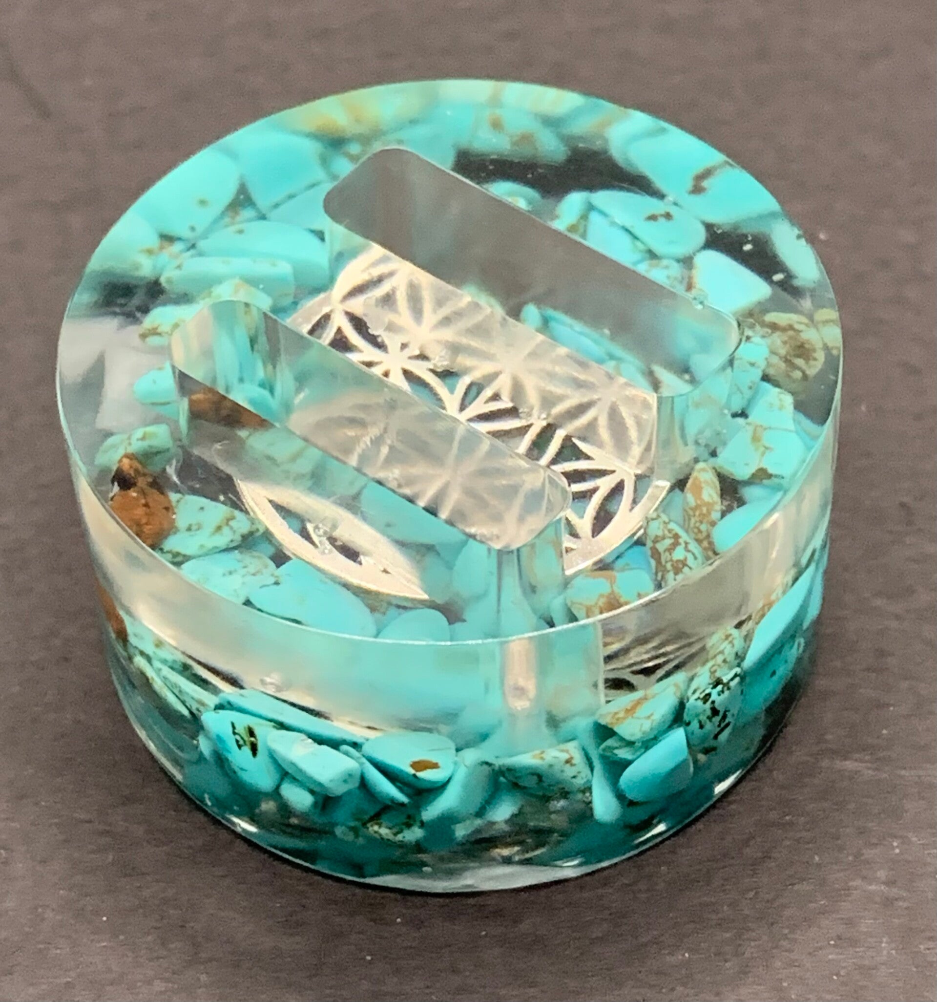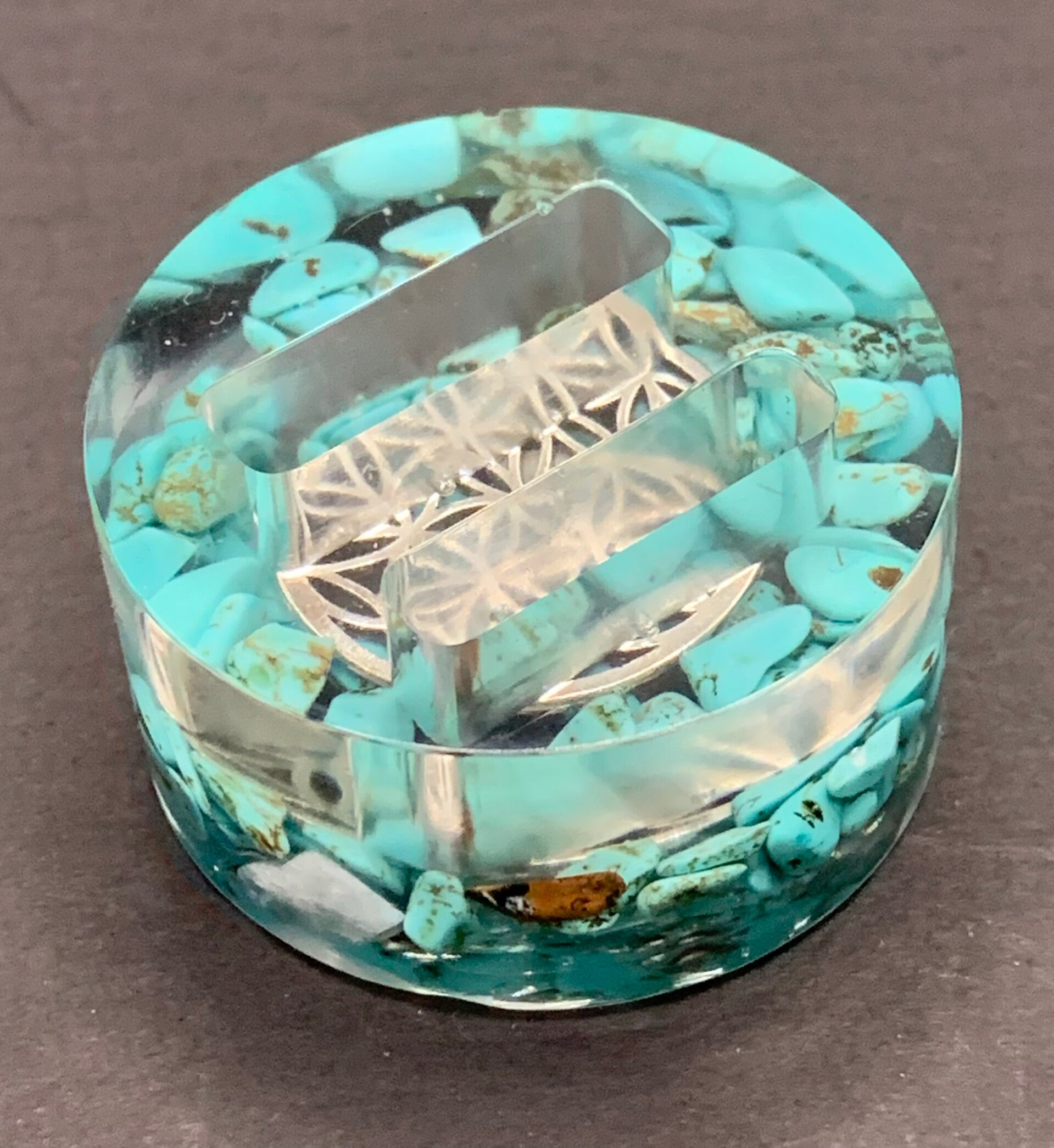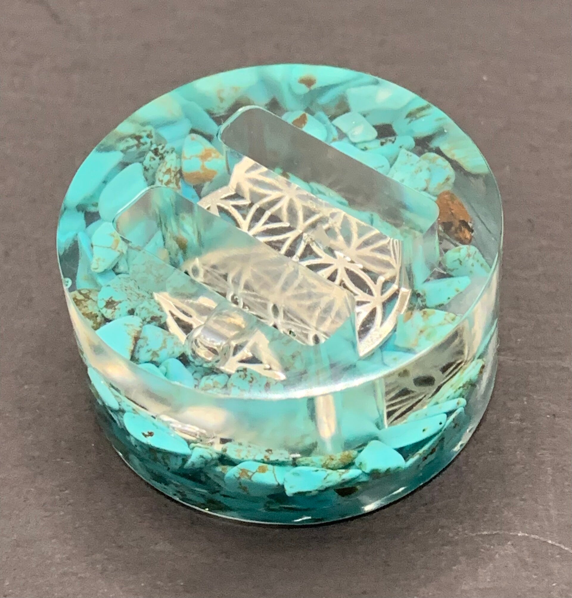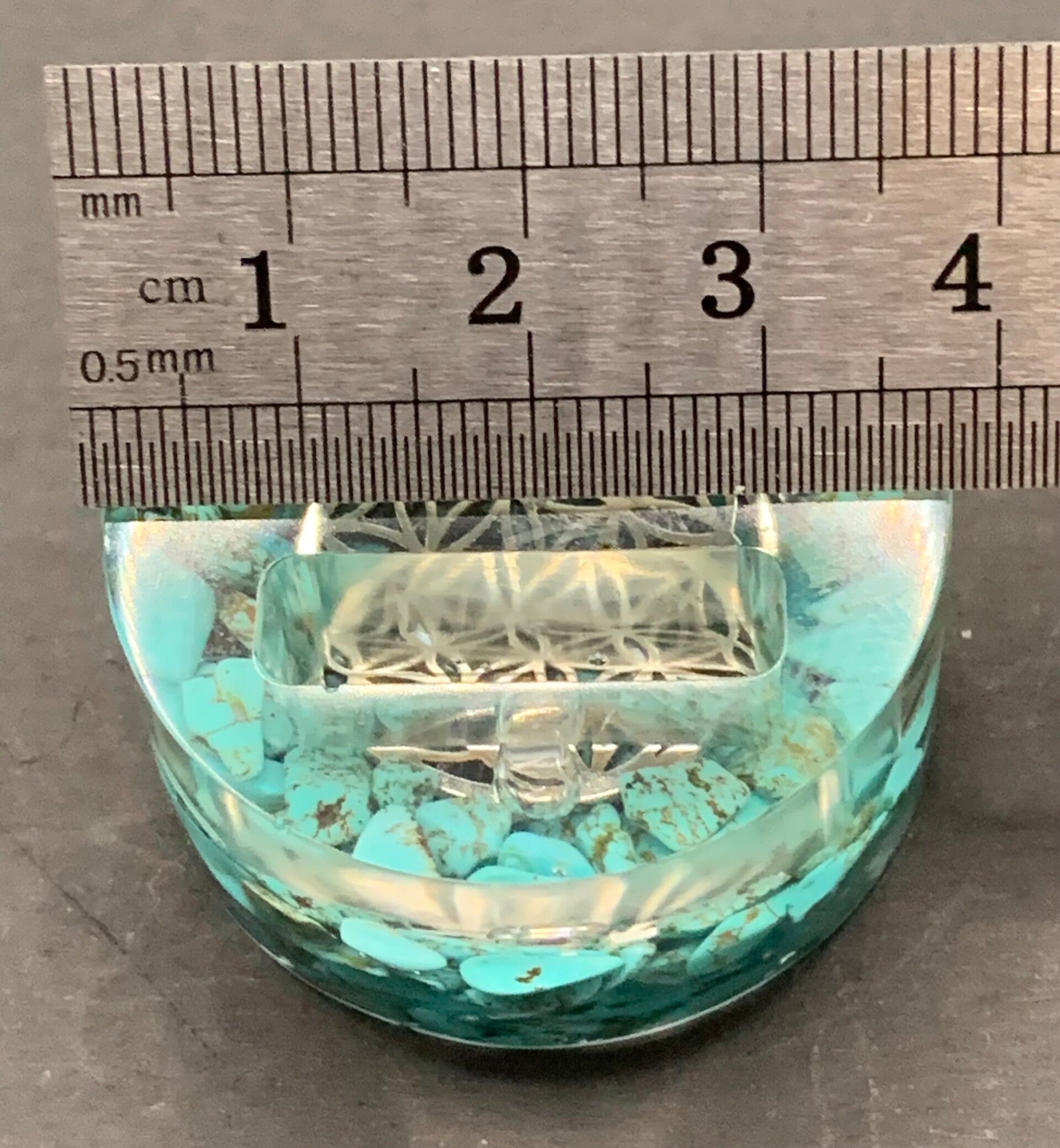 Ce support porte-bague est composé de pierre naturelle de turquoise et d'une fleur de vie
