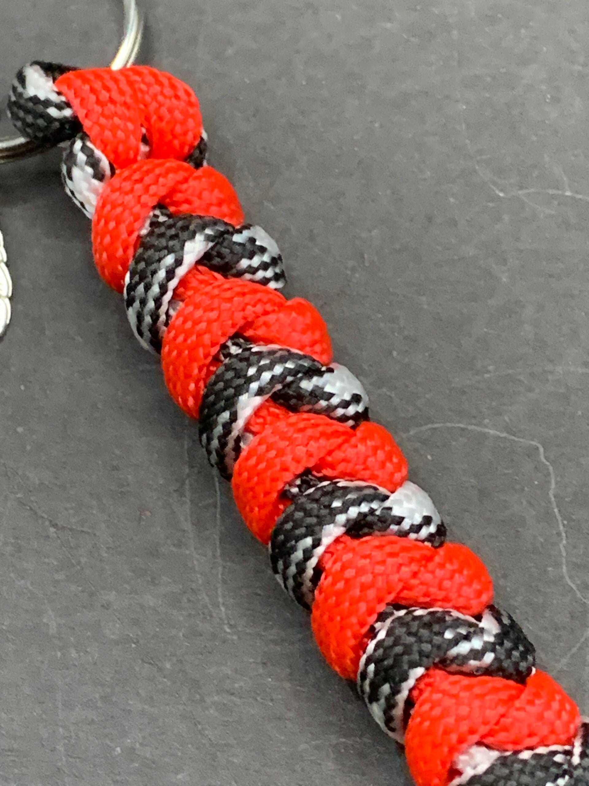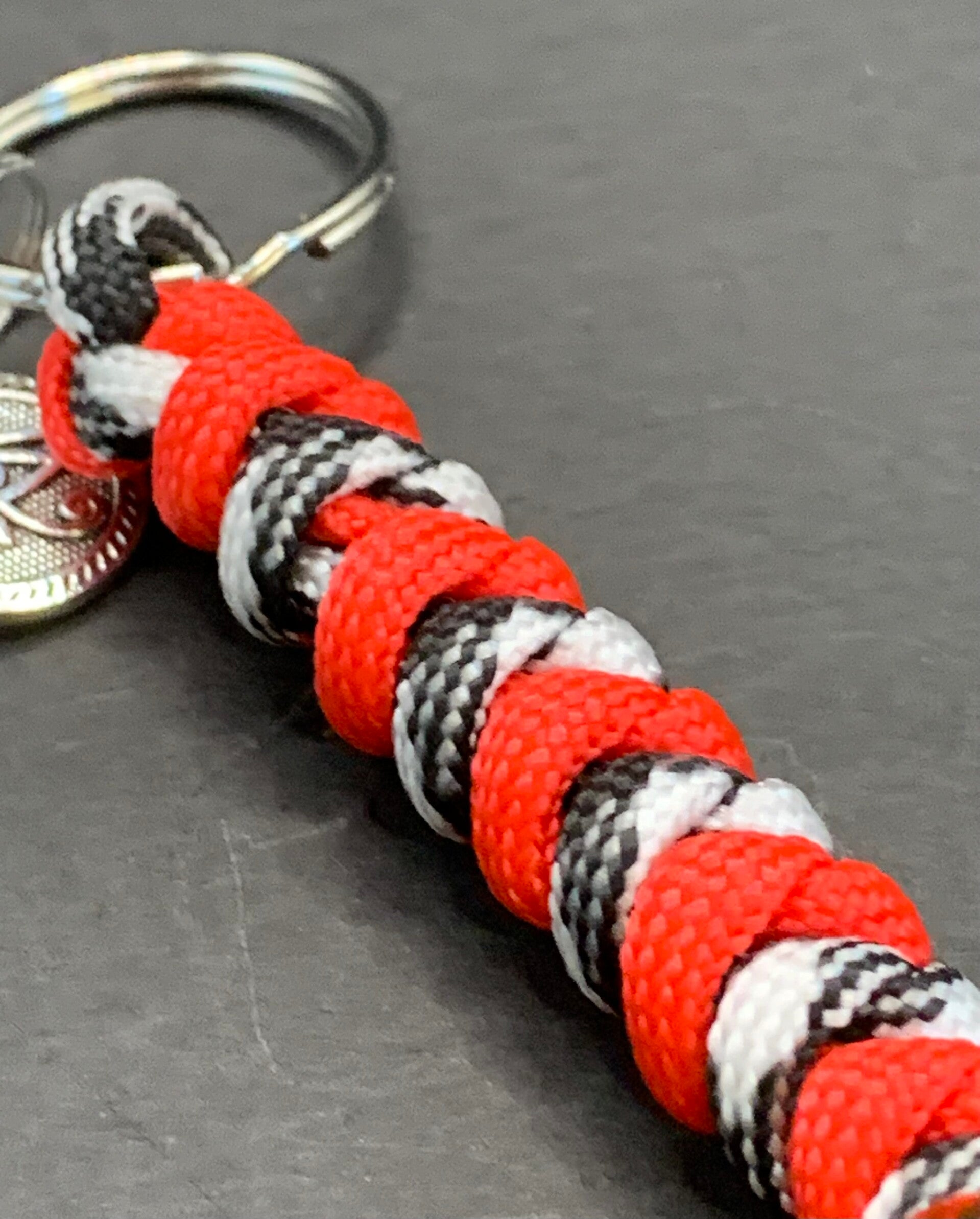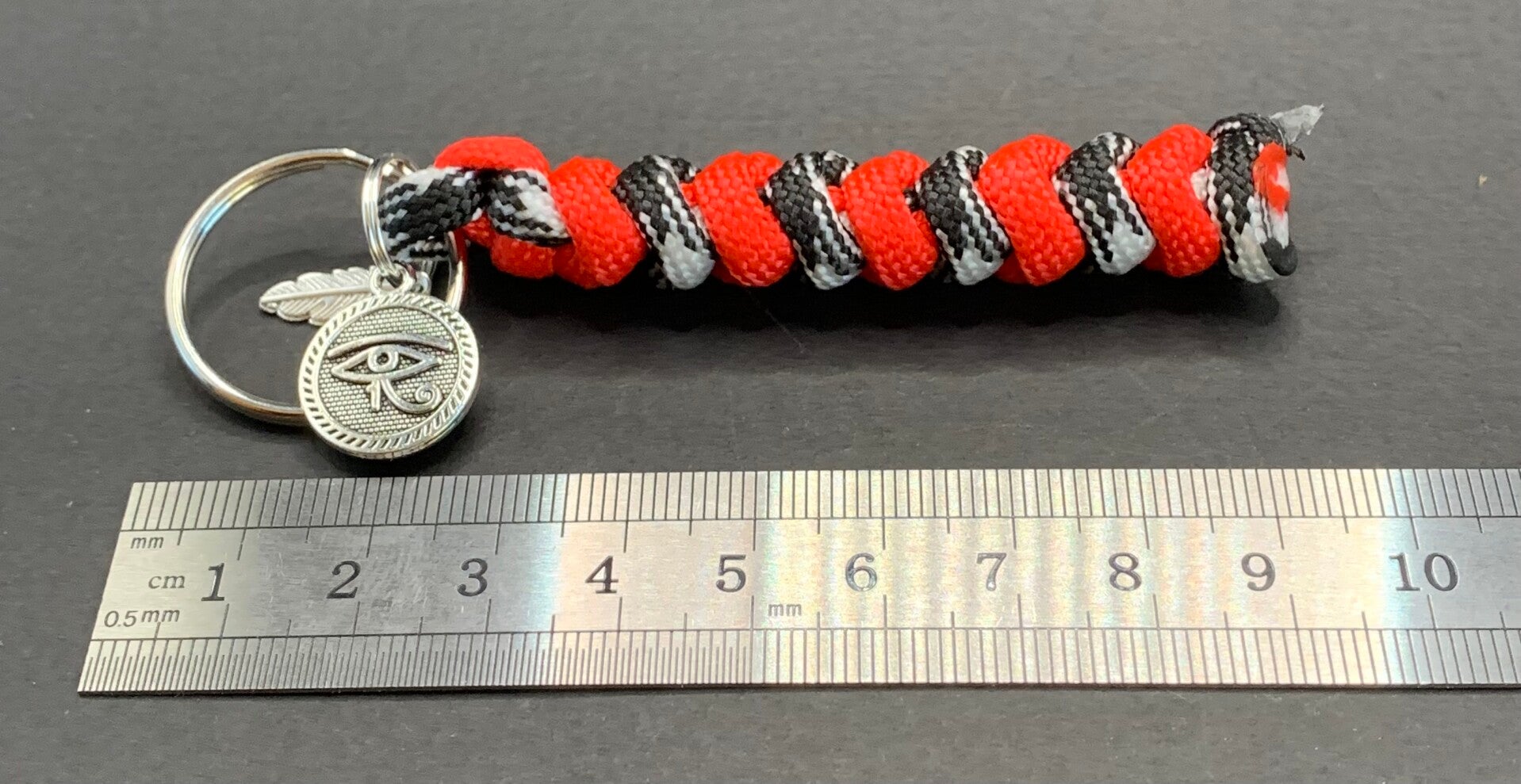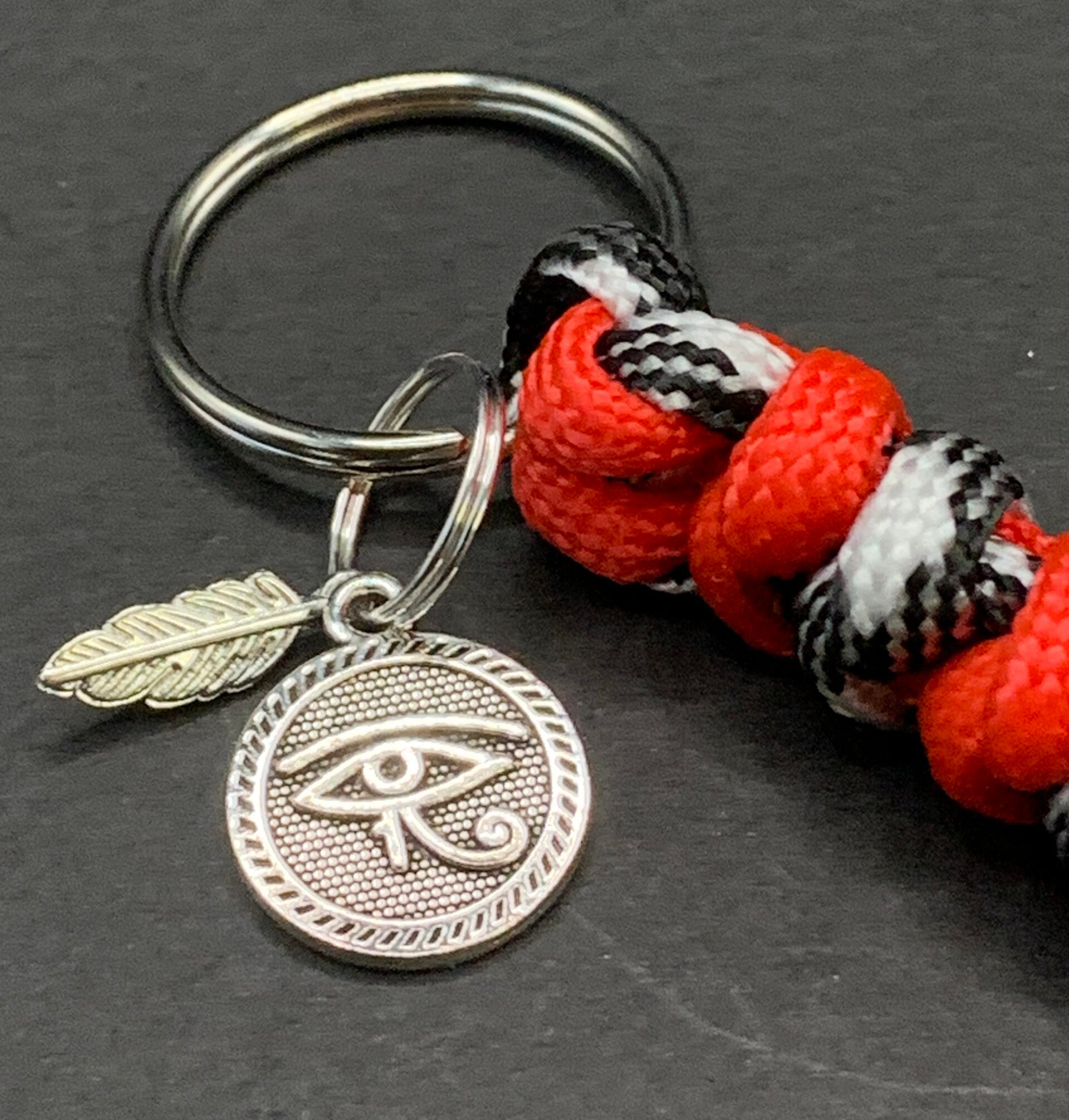 Porte-clés macramé en corde nylon de type "corde de parachute" avec une médaille de l'œil d'Horus Ra.